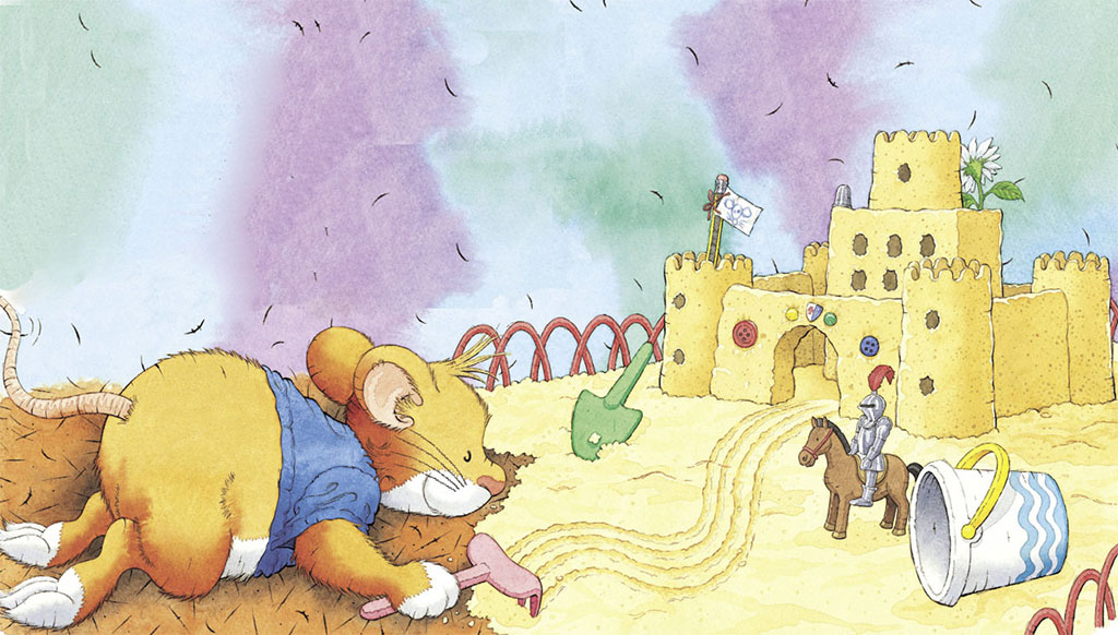 Смотри, какой чудесный замок из песка построил мышонок Тим! У него во дворе большая песочница. Тим часто приходит туда с лопаткой и ведёрком. Он любит строить дороги для игрушечных машинок, делать домики и даже целые замки. Но сегодня замок у него получился особенно хороший! С башенками, с окошками и с флагом!