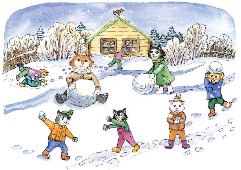 Зимним субботним утром перед самым праздником Нового года Барсик с детишками и женой Пушей решили слепить снеговика. После завтрака они вышли во двор в валенках, тёплых шарфах, варежках и шапках. Погода была хорошей, под ногами хрустел снег, солнышко только просыпалось, а с неба падали снежинки и ложились на землю. Котята сразу стали резвиться и играть в снежки, а в это время Барсик с Пушей собрали огромную кучу снега, плотно слепили его в ком и принялись катать его по сугробам. Скоро котята набегались и стали помогать папе и маме.