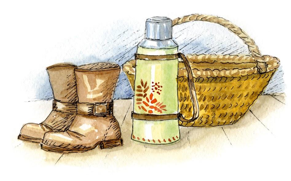 Дома Барсика дожидалась заботливая жена кошка Пуша. Она собрала Барсику с собой бутербродов с сыром, печёную картошку, горячее молоко в термосе. Достала из шкафа поношенные коричневые сапожки со шпорами и большую корзину для грибов. Петя в это время тоже собирался. Обул красные сапожки и надел шерстяной жилет.