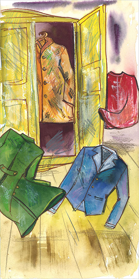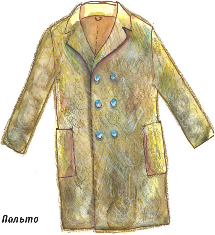 Семейство пальто на свете живётПо меньшей мере лет уж пятьсот!Спасают от холода и непогод:Шинель, манто… и редингот!Дедушка пальтоке послушал, как его внуки рассуждают о грядущих временах и о новой моде… Да и задремал, облокотившись о стенку старого шкафа.