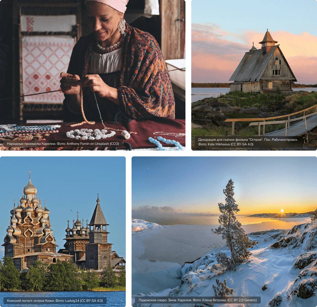 Историческое наследие. Карелия – это место, где слились разные культуры и традиции. Здесь знакомятся с жизнью древних племён и посещают древние крепости и посёлки.