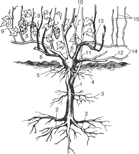 Рисунок 1. Строение виноградного куста: 1) корневой штамб; 2) пяточные корни; 3) серединные корни; 4) росяные корни; 5) голова; 6) рукав; 7) плодовое звено; 8) плодоносный побег; 9) бесплодный побег; 10) жирующий побег; 11) порослевый побег; 12) двухлетняя лоза; 13) сучок замещения; 14) плодовая лоза; 15) однолетний побег