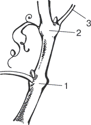 В пазухе листьев, появившихся на узлах однолетних побегов, развивается особое морфологическое образование, называющееся глазком (рис. 4). Поскольку он уходит под зиму вместе с вызревшим побегом, глазок именуется зимующим. Он лежит на подушечке, созданной небольшим возвышением. Основание глазка и подушечку разделяет подстилающий слой темно-зеленого цвета, в котором находятся зачаточные почки. Если почки глазка погибают, зачаточные дают начало новым побегам.