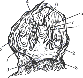 Рисунок 4. Строение виноградного глазка: 1) главная почка; 2) замещающие почки; 3) чешуйки; 4) зачатки соцветия; 5) волоски; 6) зачатки усика; 7) зачатки листочка; 8) подстилающий слой; 9) подушечка