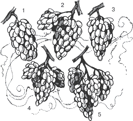 Рисунок 8. Виды виноградных гроздей по форме: 1) цилиндрическая; 2) коническая с крылом; 3) коническая; 4) коническая с лопастями; 5) ветвистая