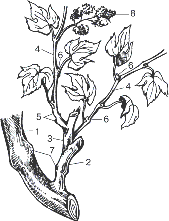 Рисунок 9. Части рукава винограда: 1) четырехлетняя лоза; 2) трехлетняя лоза; 3) двухлетняя лоза; 4) однолетний побег; 5) угловая почка; 6) зимующий глазок; 7) узел со спящей почкой; 8) соцветие