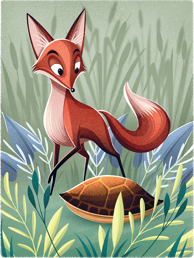Лиса в ярости повернулась к черепахе, решив съесть её вместо лягушки. Но не успела лиса и пасть раскрыть, как черепаха спрятала голову, лапки и хвост в свой крепкий панцирь. Лиса попробовала прокусить эту броню, но только зубы поломала. Отчаявшись, лиса сказала: