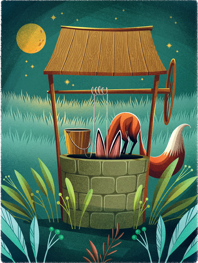 Как и все лисы, наш лис был очень хитрым. Он громко позвал волка и пригласил его полакомиться роскошным сыром, который лис нашёл на дне колодца.