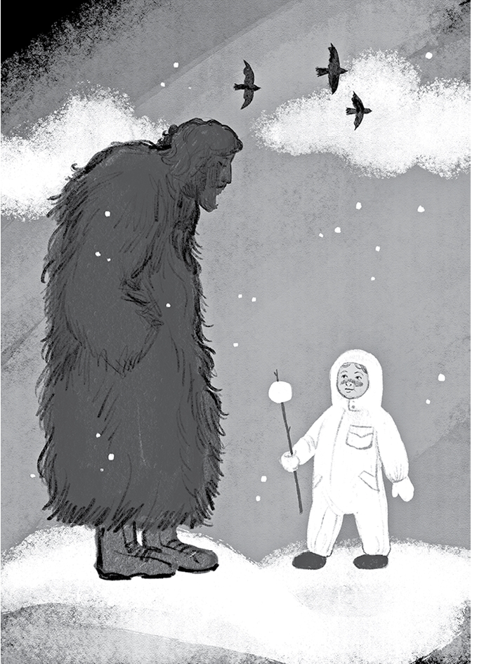Олень ложится на чужое крыльцо, смотрит в небо. Звезды кружатся, собираются то в костер, то в печь, летят горящими пепелинками. Олень поднимает руки, чтобы погреться, но вдруг открывается дверь, за дверью – женщина, в руках фонарик. Она хочет, наверное, впустить Оленя, но смотрит на его квадратное лицо, на голые поднятые руки, на щеку со шрамом. Закрывает дверь, а через минуту открывает снова, протягивает Оленю одеяло, хлеб, кувшин кумыса. От одеяла пахнет шерстью и звериной свободой, от хлеба – дымком.