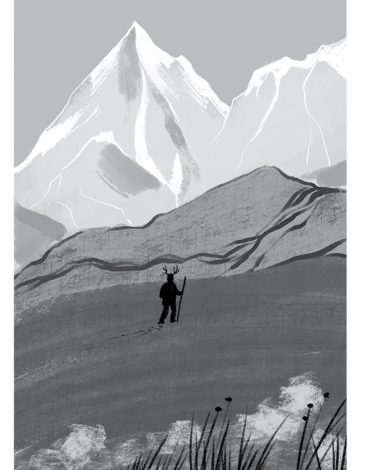 Олень взваливает на спину рюкзак и двигается дальше. Дорога – то грязь, то каменные глыбы, всюду змейками текут ручьи. Олень вспоминает: змейки ищут проход в нижний мир, связывают его с миром средним. Солнце пытается пролезть сквозь дыру в плотной туче из мира верхнего. Из-за тумана не разглядеть ничего, и солнце окрашивает воздух в песочный цвет.