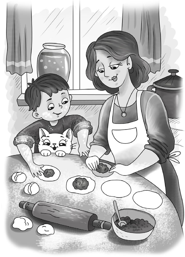 Вместе с мамой леплю пельмени.Ох и мука! В муке – колени,И ладошки, и нос, и ушки.Стала белою кошка Мушка.Улыбается кошка хитро:– Дайте мне молочка пол-литра.– Не смотри на пельмени, кошка.Вот сварю – тогда дам немножко.Молочка хватит и полкружки!…Почесала кошка за ушкомИ запрыгнула на колени —Так удобнее ждать пельмени.