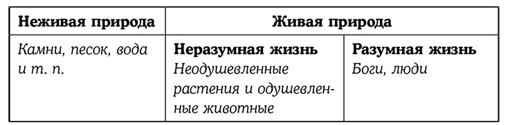 Стоики считали, что у неживой природы, у животных и у растений по-разному распределена пневма (то есть душа). Возьмем кошку, фиалку и камень. Как они взаимодействуют с окружающим миром? Кошка – бегает, прыгает, гоняется за мышью, выпрашивает еду. Фиалка неподвижно стоит на месте и только медленно поворачивает листочки к солнцу. А камень просто лежит, не шевелится и ни на что не реагирует.