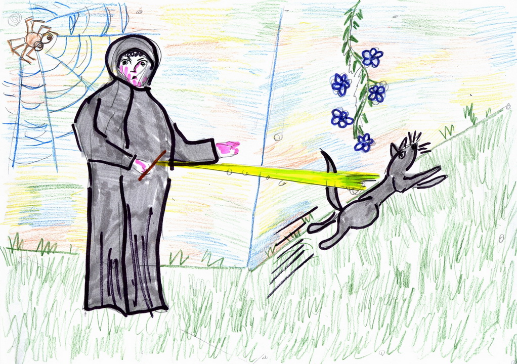 Однажды утром Сэмми прогуливался по дорожкам в парке вокруг Высокого замка. Он совсем уже освоился в своём новом жилище. Хозяйки были очень добры к нему, просто души в нём не чаяли, никогда ни в чём ему не отказывали, поэтому Сэмми чувствовал себя весьма уверенно. И вдруг, откуда ни возьмись, перед котиком возник незнакомец с недобрым лицом в длинном черном плаще. Сэмми был отважным котиком и храбро обратился к незнакомцу с вопросами, кто он такой и что делает без разрешения в чужом парке. Человек в плаще злобно усмехнулся и ответил, что скоро он, Сэмми, узнает, кто перед ним, поскольку сейчас Сэмми начнёт полностью повиноваться новому хозяину. Да-да, перед ним именно его будущий хозяин, а также хозяин Высокого замка и всего Заколдованного леса. И незнакомец разразился зловещим хохотом. Сэмми не очень понял, что сказал ему человек в плаще и, хотя котик растерялся и испугался, он не подал вида и решительно возразил чужаку, что тот лжец, что его хозяйки – волшебницы Стела и Велина, что замок принадлежит им, так что пусть незнакомец убирается поскорее. И Сэмми, развернувшись, бросился в замок, сообщить обо всём Велине и Стелле, но не успел он пробежать и нескольких шагов, как был настигнут заклинанием. Котик вскрикнул, перевернулся в воздухе и остался лежать без чувств на дорожке.