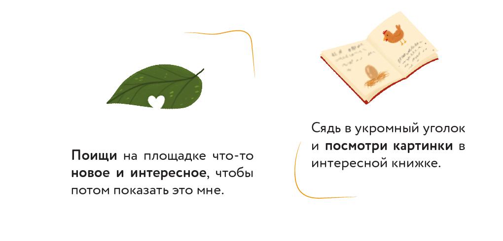 – Малыш, давай сделаем так: я посижу немного на этой лавочке, пока ты играешь с ребятами. Как только тебе захочется меня увидеть, посмотри в мою сторону, и я тебе помашу! Договорились? Когда я пойму, что ты нашел себе друзей, то вернусь домой. А когда ты наиграешься, я приду за тобой и ты мне всё-всё расскажешь.