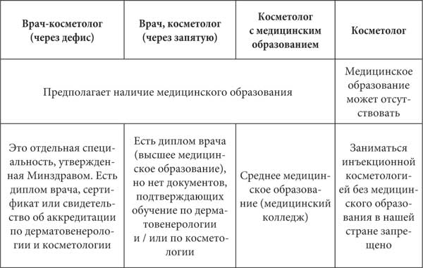 Закон[6] четко регламентирует, кто имеет право работать врачом-косметологом и какое образование должно быть у этого специалиста (табл. 1).