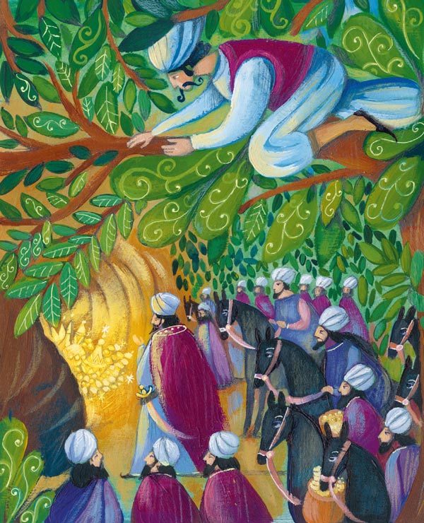 А шум между тем становился всё громче и громче. Али-Баба испугался и полез на дерево, чтобы спрятаться. Ослик убежал и скрылся из виду, и тут Али-Баба увидел группу всадников. Они остановились как раз под деревом, на котором он притаился.