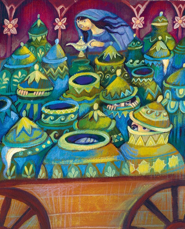 На следующий вечер Али-Баба услышал стук в дверь. На пороге он увидел бродячего торговца с телегой, на которой стояли сорок огромных кувшинов.
