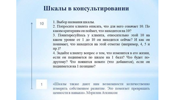 Шкала является простой и одновременно эффективной технологий, которая помогает сверять уровень приближенности к цели, к желаемому результату; простраивать шаги по достижению цели; поддерживает клиента в изменении мышления от «или-или» к опыту «и».