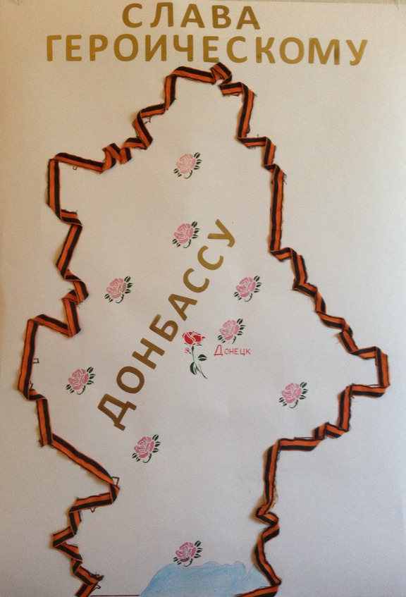 Для проведения акции на листе ватмана были нанесены контуры Донецкой области в ее административно-территориаль-ных границах 2014 года и обрамлены георгиевской лентой. Пространство внутри границ оставлено свободным. Крупные райцентры на «карте» обозначены розами – одним из символов Донецка. На карте крупными золотистыми буквами в верхней части листа и внутри границ области размещена надпись «Слава героическому Донбассу».