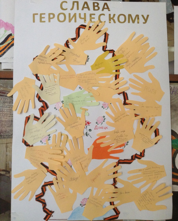 Студентам и преподавателем предлагалось на заранее подготовленных ладошках, вырезанных из цветной бумаги телесных оттенков написать пожелание жителям Донбасса в День его освобождения от фашистско-немецких захватчиков. Обращение к участникам звучало следующим образом: «8 сентября 1943 года Донецк был освобожден от немецко-фашистских оккупантов. Донбасс в своей истории уже проживал тот период, который мы проживаем сейчас. Что бы вам хотелось пожелать жителям Донбасса сегодня?»