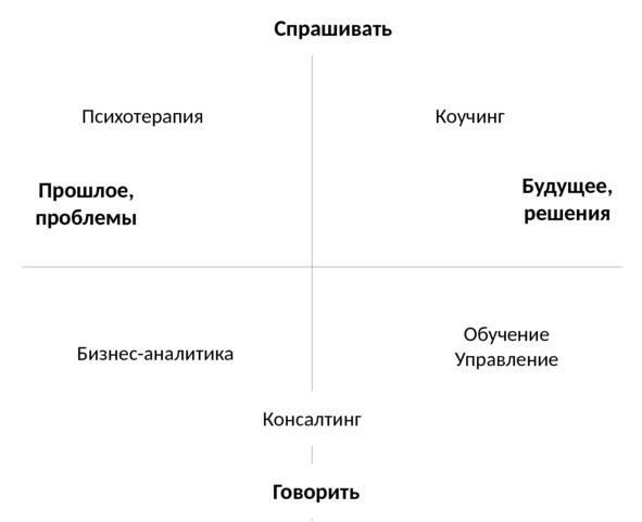 Отличие коучинга от смежных специальностей иллюстрирует график, построенный с помощью 2-х линий, одна из которых – это линии времени, вторая – шкала профессиональной активности специалиста (рис. 1.2). И если деятельность психотерапевтов, психологов, бизнес-аналитиков направлена на решение проблем в прошлом, то деятельность коуча состоит в построении такой формы взаимодействия с клиентом, когда из ситуации «сейчас» мы идем в ситуацию «завтра» через поиск и реализацию целей клиента путем постановки «сильных» вопросов [1].