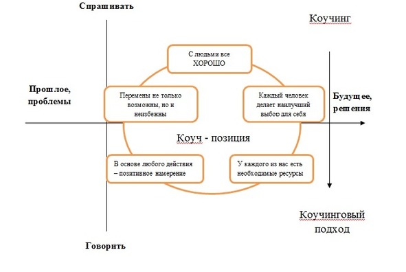 Коучинговый подход в отличие от коучинга состоит в привнесении в процесс обучения, развития или управления коучинговой позиции и инструментария коуча, что позволяет, скажем, преподавателю проводить занятия, а руководителю собрания и совещания в коучинговом стиле, которые вдохновляют и мотивируют его участников. Другими словами, коучинговый подход позволяет подключать в профессиональную деятельности элементы коучинга: коуч-позицию и инструменты коучинга [1].