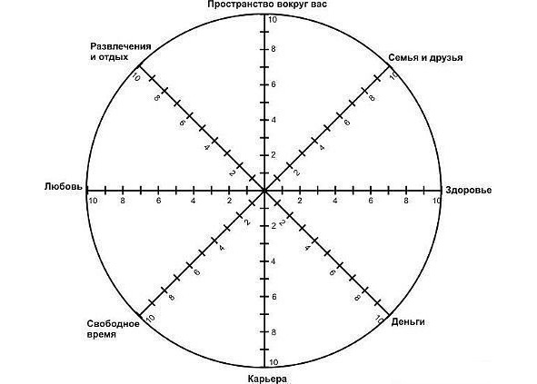 Это упражнение нужно делать минимум один раз в месяц, чтобы видеть, на чем Вы едете по своему жизненному пути. Перед вами классический вариант колеса жизненного баланса, которое объединяет ключевые жизненные сферы, такие как семья и друзья, здоровье, деньги, карьера, свободное время, любовь (отношения), развлечения и отдых, пространство вокруг вас. Возможно, название какой-то из сфер вам бы хотелось изменить или дополнить, или добавить еще несколько сегментов, которые присутствуют в вашей жизни? Сделайте это так, чтобы колесо охватывало все стороны вашей жизни.