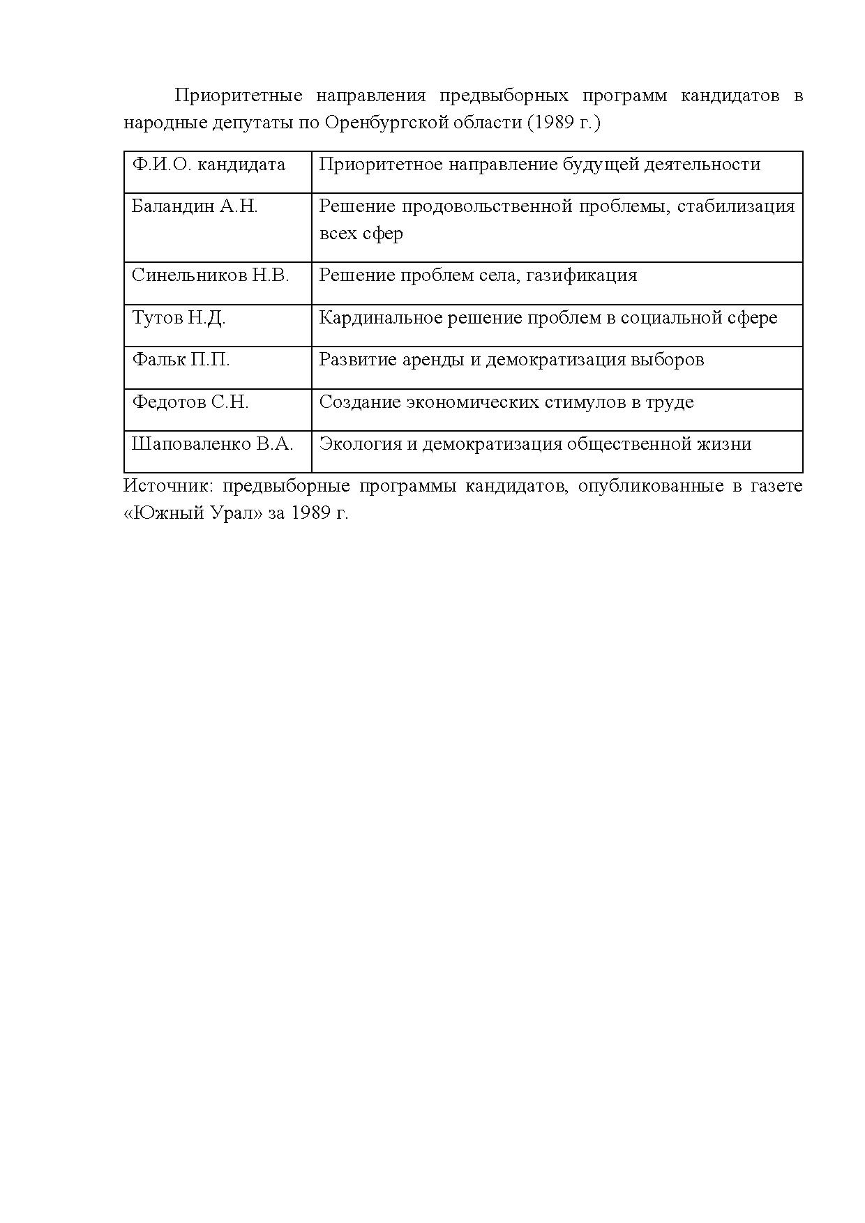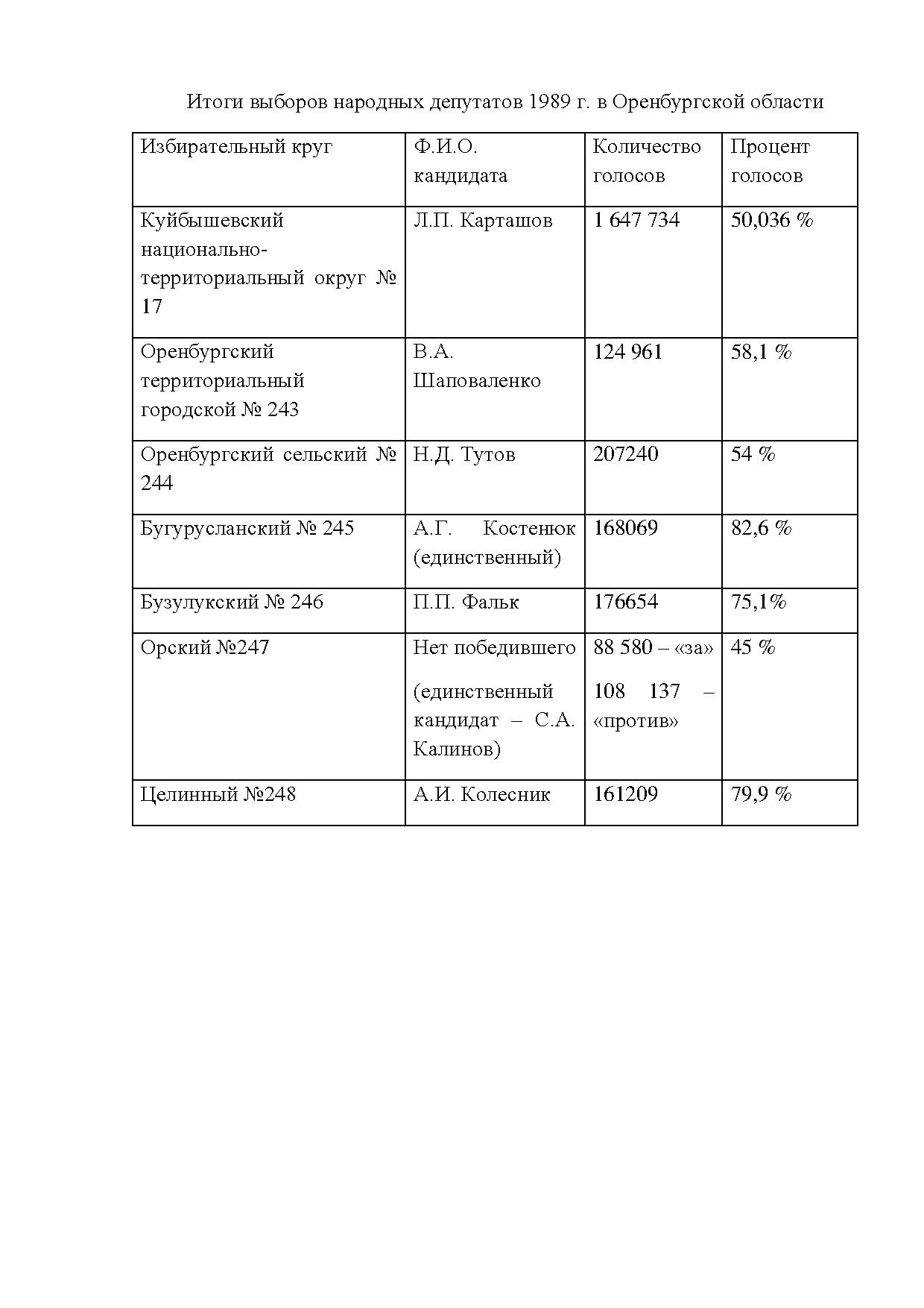 Данная предвыборная кампания отличалась противоречивостью и неординарностью, новизной. В итоге в выборах приняли участие 88,7 % избирателей, процентное распределение голосов мы видим в таблице 2.2. Выборы народных депутатов 1989 г. в Оренбуржье, действительно, имели демократический характер. Кандидаты, не пользующиеся поддержкой партийных структур на этапе предвыборной кампании, В. А. Шаповаленко (Оренбургский городской округ № 243), противостоявший С. Н. Федотову и Н. Д. Тутов (Оренбургский сельский № 244), конкурировавший с первым секретарём обкома КПСС А. Н. Баландиным., одержали победу. Не был избран С. А. Калинов (Орский №247).212