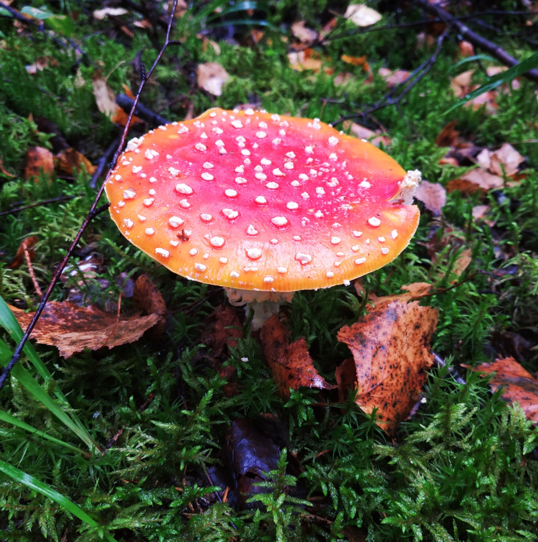 У этого красавца ярко-красная или оранжевая шляпка с белыми точками, как будто кто-то его краской забрызгал, есть колечко бахромы на ножке, похожее на юбочку, а на самом её основании – чешуйки.