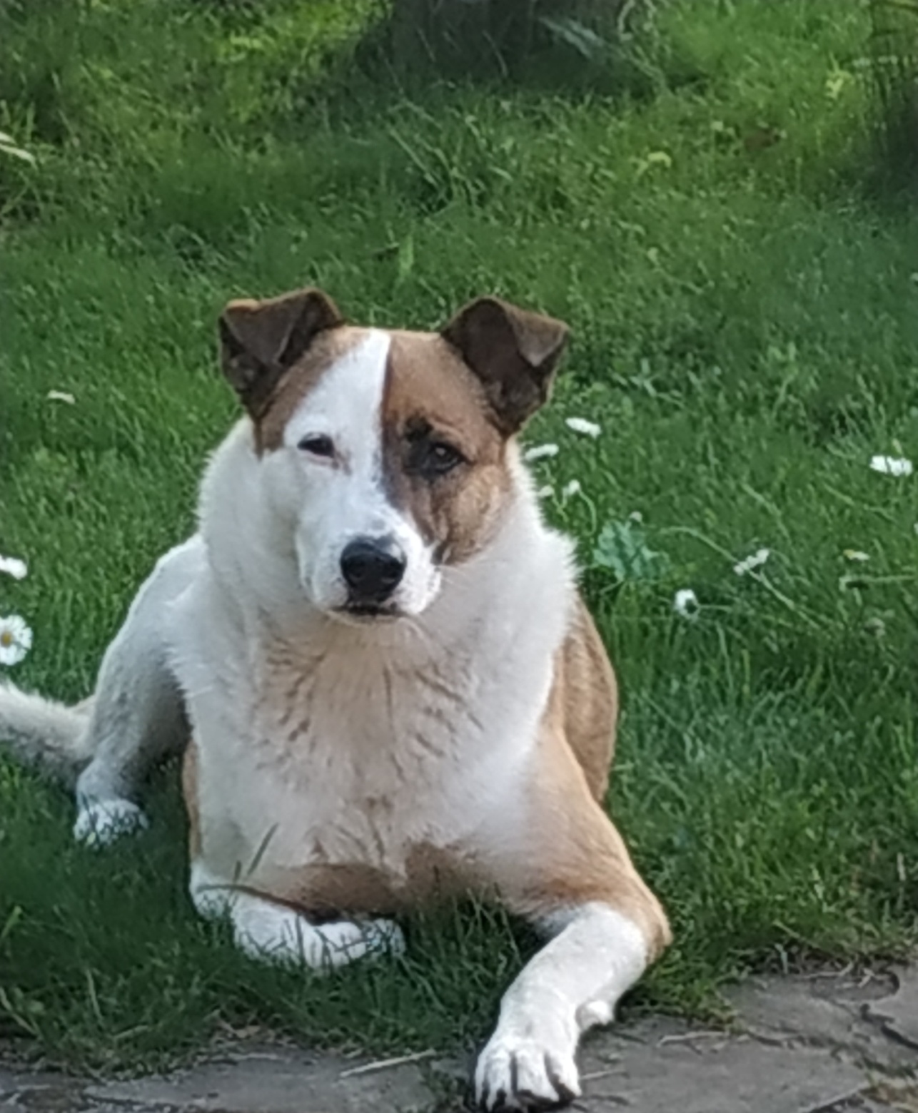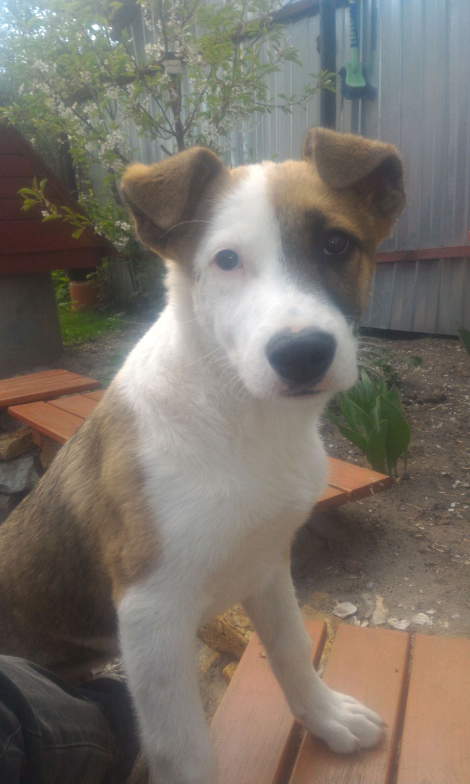 Отложил я интернет в сторону и стал смотреть на щенка: мордашка поделена на две части, одна – белая, другая – коричневая; уши стоячие, но сами кончики смешно висят; выражение мордахи ещё детское и наивное.