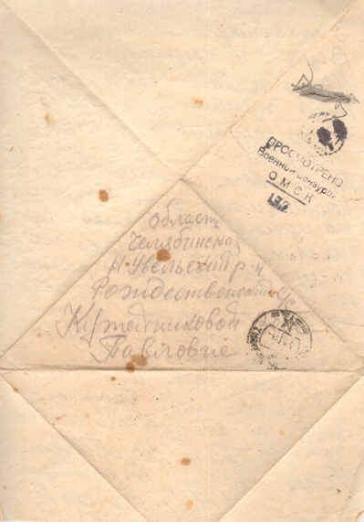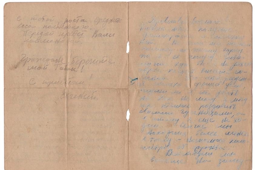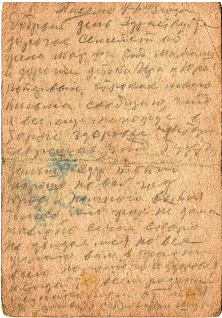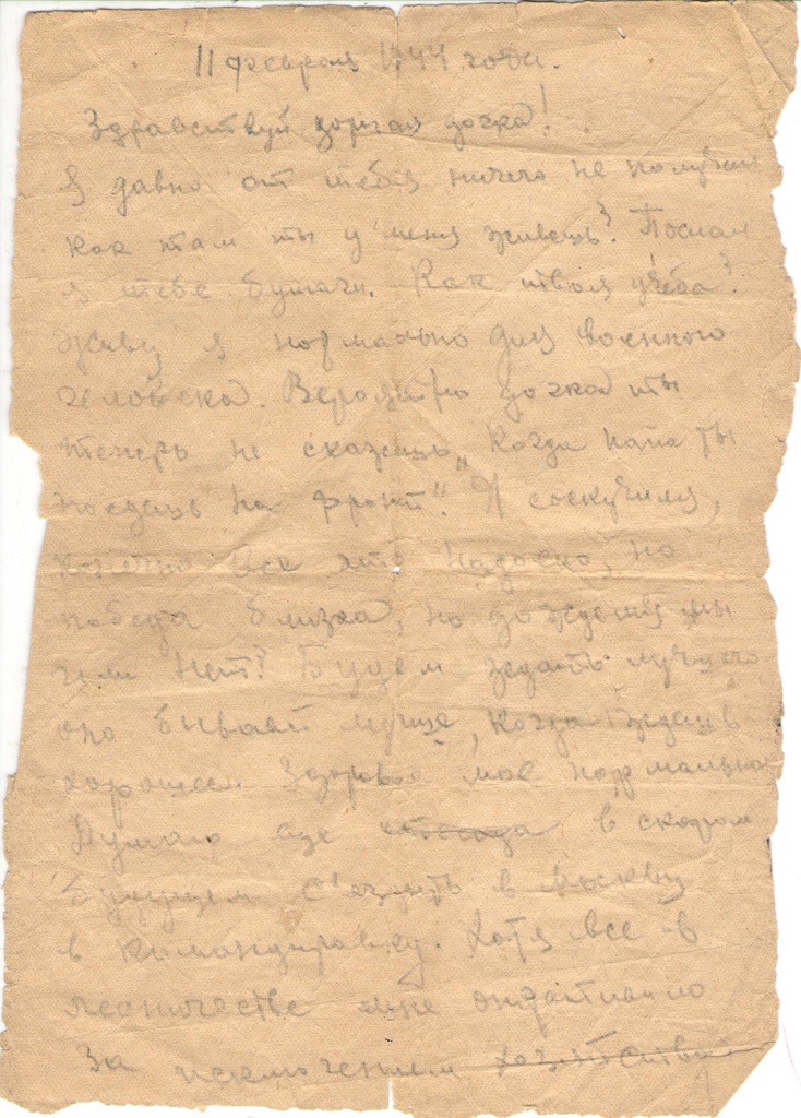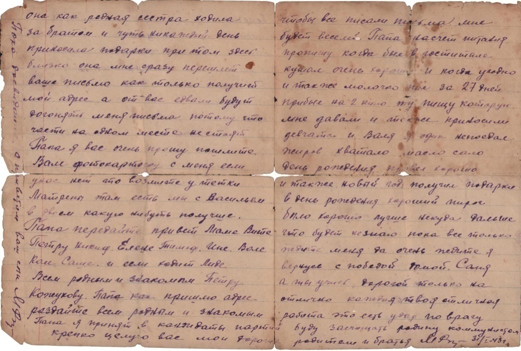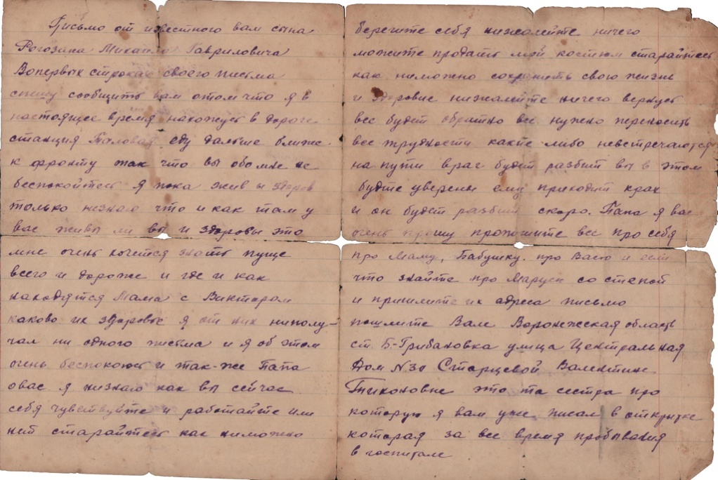 Во первых строках своего письма спешу сообщить вам отом что я в настоящее время нахожусь в дороге станция Таловая еду дальше ближе к фронту так что вы обо мне не беспокойтесь я пока жив и здоров только не знаю что и как там у вас живы ли вы и здоровы это мне очень хочется знать пуще всего и дороже и где и как находится мама с Виктором каково их здоровье я от них ниполучал ни одного письма и я об этом очень беспокоюсь и так-же Папа о вас я низнаю как вы сейчас себя чувствуйте и работайте или нет старайтесь как берегите себя нижалейте ничего можите продать мой костюм старайтесь как ниможно сохранить свою жизнь и здоровие нижалейте ничего вернусь все будет обратно все нужно переносить все трудности какие либо невстречаются на пути враг будет разбит вы в этом будте уверены ему приходит крах и он будет разбит скоро. Папа я вас очень прошу пропишите все про себя про маму, Бабушку. Про Васю и если что знайте про Марусю со степой и пришлите их адреса письмо пошлите Вале Воронежская область ст. Б.-Грибановка улица Центральная Дом № 34 Старцевой Валентине Тихоновне это та сестра про которую я вам уже писал в открытке которая за все время пробывания в госпитале она как родная сестра ходила за братом и чуть ни каждый день приносила подарки при том здесь близко она мне сразу перешлет ваше письмо как только получит мой адрес а от вас едвали будут догонять меня письма потому что части на одном месте не стоят Папа я вас очень прошу пошлите Вале фотокарточку с меня если унас нет то возьмите у тетки Матрены там есть мы с Васильем в двоем какую нибудь получше. Папа передайте привет Маме Вите Петру Никиф. Елене Тимаф. Ине. Воле Коле Саше. И если ходит Лиде Всем родным и знакомым Петру Кожукову. Папа как пришлю адрес раздайте всем родным и знакомым Папа я принят в кандидаты партии крепко целую вас мои дорогие чтобы все писали письма мне будет веселей Папа насчет питания пропишу когда был в гоститале кушал очень хорошо и когда угодно и также молочко пил за 27 дней прибыл на 2 кило ту пищу которую мне давали и также приносили девчата и Валя я один непоедал жиров хватало масло сало День рождения провел хорошо и также новый год. Получил подарки в день рождения хороший пирог было хорошо лучше некуда Дальше что будет не знаю пока все только ждите меня да очень ждите я вернусь с победой домой. Саня а ты учись дорогой только на отлично каждая твоя отличная работа это есть удар по врагу