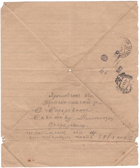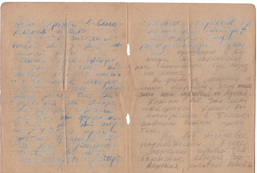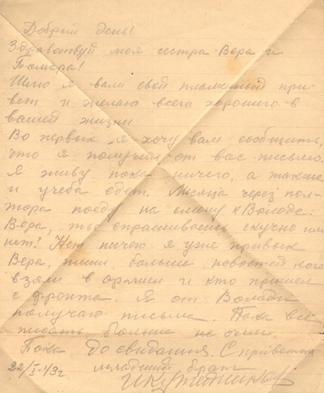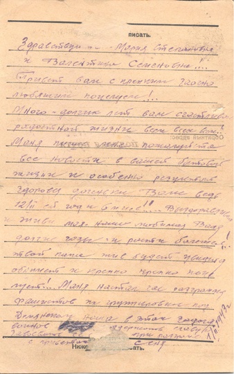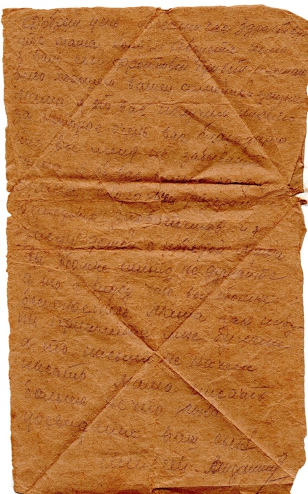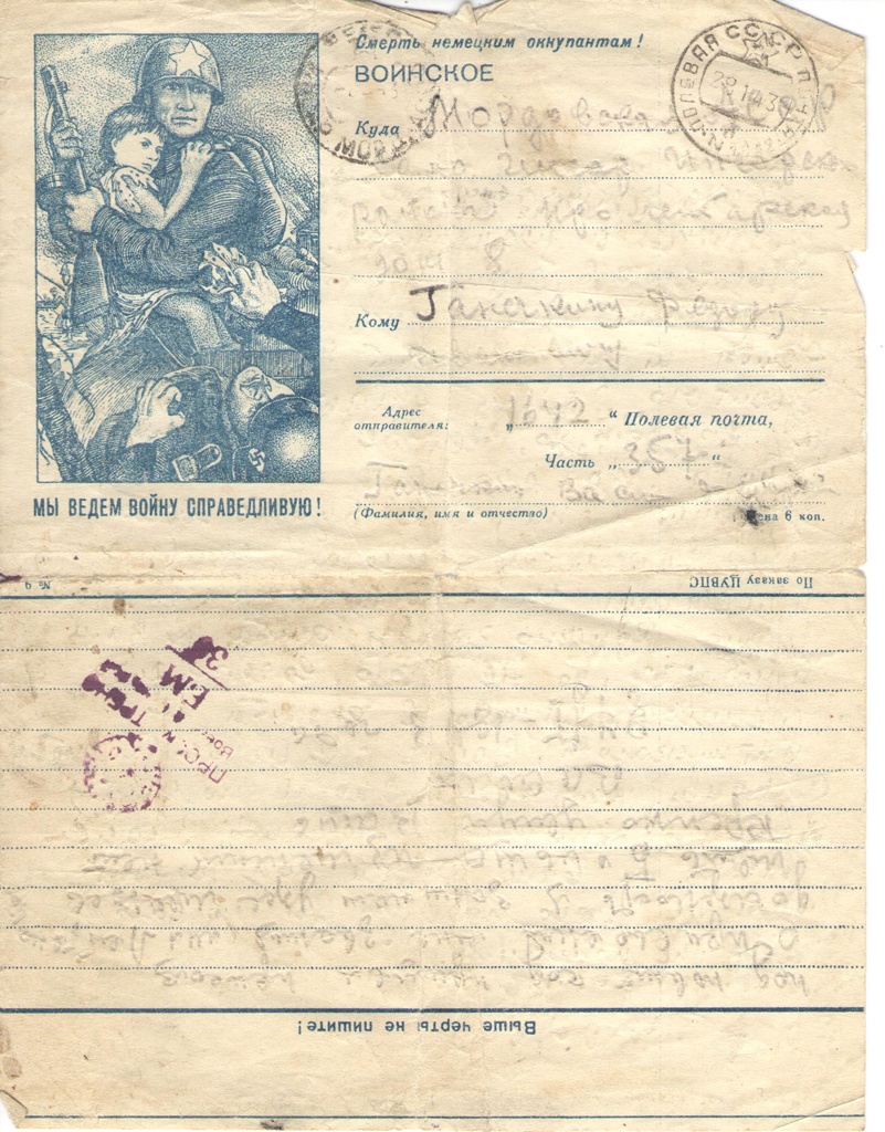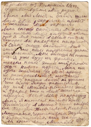 Добрый день веселый час Здравствуйте мама, Коля и Августа шлю я вам свой фронтовой привет и желаю всего хорошего вашей семейной жизни Мама я от вас получил письмо за которое очень вас благодарю но вы меня не забывайте. Мама я по вас сильно соскучился Мама скоро мы разгромим немецких захватчиков и я вернусь домой с победой. Мама вы обомне сильно не думайте а то я вижу что вы обомне беспокоитесь Мама как нибуть пришлите мне бумаги а то письма не начем писать Мама писать больше нечего пока