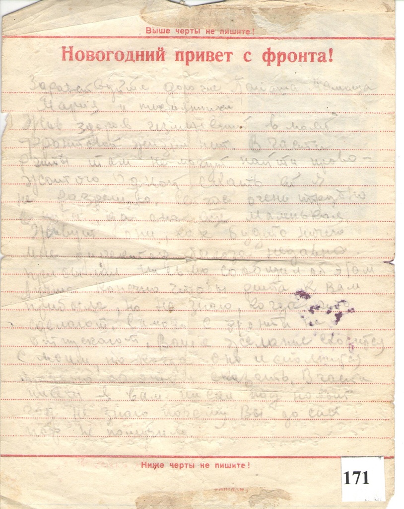 Добрый день Здравствуйте дорогое семейство жена Марфа, Ст. Мамаша и дорогие детьки Ира и Юра. Вопервых строках моего письма сообщаю, что я все еще нахожусь в дороге здоровье чувствую хорошее что будет дальше еду тепло хорошо Новый год немного выпил только, что жил не дома наверно сечас скоро не увидимся но все желаю вам в жизни всего хорошего и здоровья.