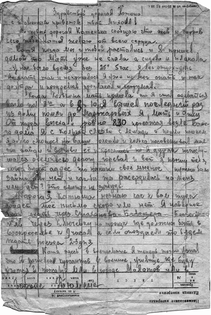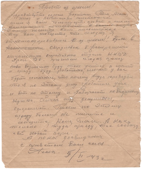 Здравствуйте дорогие родители, Рита, Миша, Яша и ребятишки племяннички шлю я вам большущий привет и массу наилучших пожеланий в вашей жизни вашему Спешу послать вам письмишко, и хочу вам сообщить, что сегодня, я откомандировался из школы! Один в Свердловск в расположение начальника оперативного отдела НКВД. Грач В.О. прислали сегодня приказ возможно буду там учится а может и сразу буду работать, может у вас будет сомнение, что почему туда переводят то я по этому делу сработал уже и вот по этому и забирают повидимому нужно. Сейчас жду документы, оформляют. Писем по этому адресу больше не пишите и сообщите Коле, Толе. А как только туда приеду, так сообщуу свой новый адрес.