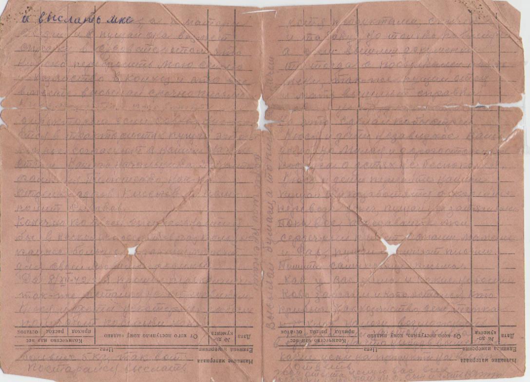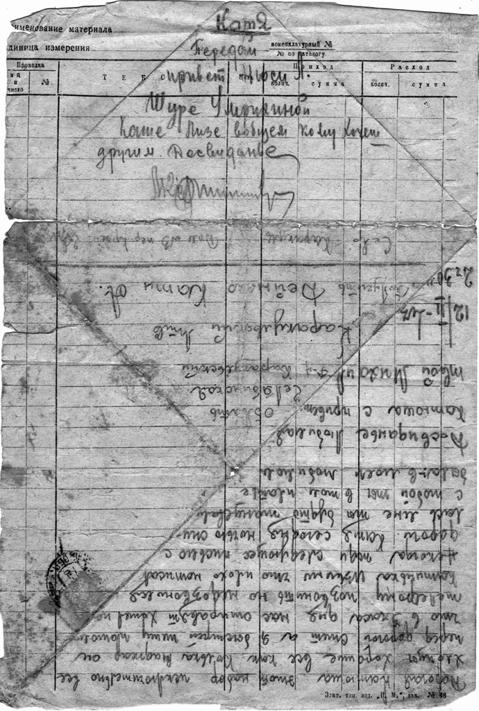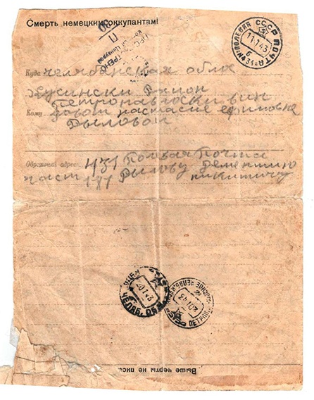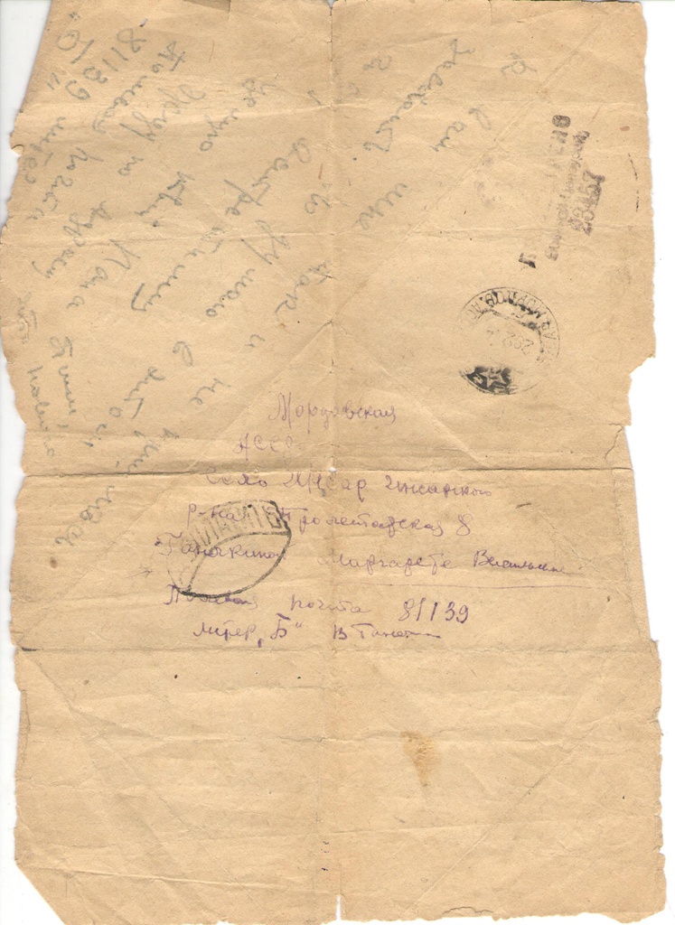 Тоесть после этой открытки жди нового адреса. Липа ты будь спокойна за меня прошу не растраиваться. Ты знаеш успехи наших войск на фронте что скоро капут фашистам.