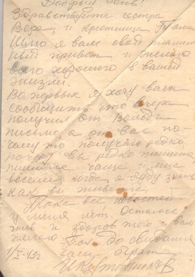 Во первых я хочу вам сообщить что вчера получил от Володи письмо, а от вас почему то поучаю редко, почему вы редко пишите, пишите чаще и мне веселее когда я буду знать как вы живете.