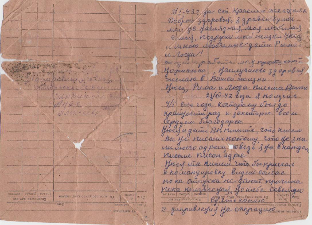 5 января 1943 года ст Красиный железняк Доброго здоровья, здравствуйте мои не наглядная, моя любимая семья, подруга моей жизни Нюся и мною любимые дети Рима и Люда!