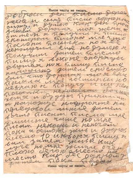 Добрый День Письмо Дорогой жене и сыну Письмо софронта сижу и Думаю как Ден Прошо затем Дорогая моя жена я от тебя я получил я Письмо в котором Писола мне что Послона посылка но я ее неполучил еще по Думаю и Получит затем Письмо Пишу я в окопе снаряды рвутся но я Пишу Письмо народину затем спосибо вам что Дорогая моя еще Послала мне гостинсы но незнаю я Получу или нет Посылки непосылай больше хотя и будут Принимат я нахожусь нафронте на Передовой линии затемвочто Писат Письма мне Пишите чаще но мне Писат некогда и непочом Пока я остоюс жиь и здоров Письмо 10 инваря пишу я вам затем живи как лучше по мне жили очен Плохо бегаю сместо на место как бес … затем пока