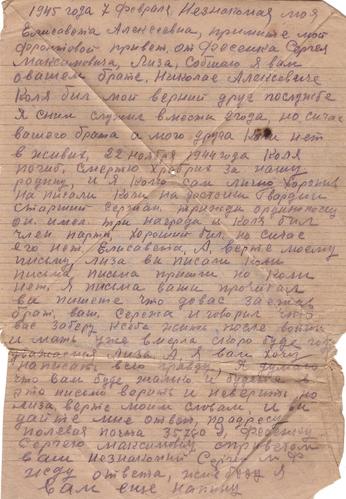 1945 года 7 февраля Незнакомая моя Елисавета Алексеевна, примите мой фронтовой привет от Фесенка Сергея Максимовича, Лиза, Собшаю Я вам о вашем брате, Николае Алексевиче