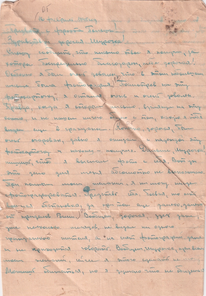 Спешу сообщить, что письмо твоё я получил, за которое беспредельно благодарен, тебе дорогая! Особенно я был очень доволен, что в этом небольшом письме была фотография. Посмотрев на эту фотокарточку, я остался очень и очень доволен. Правда, когда я открыл письмо, взглянул на эту копию, и не нашёл ничего общего с тем, какую я тебя видел ещё в гражданке. Конечно, дорогая, был очень очарован, давно я ожидал с надеждой эту фотокарточку и наконец – получил. Дальше, Шурочка! Пишишь, чтоб я выслал фото с себя. Вот уж это дело для меня абсолютно абсолютно не выполнимо. При полном моём желании, я ни могу нигде сфотографироваться. Представь себе, боевая, то есть военная обстановка, да при том ещё далеко, далеко от приделов России. Вообщем, дорогая, здесь даже, уже несколько месяцев, не видал ни одного гражданского жителя, а на счёт фотографий, даже и не приходится говорить. Вообщем, Шурочка, при всём моём желаний, сейчас я этого сделать не могу. Можешь обижаться, но я думаю что не обидешься всё же войдешь в моё положение. Ну, на счёт этого пока кончим разговаривать, конечно, нет сомнения при полном желаний, при первом удобном случае, я это зделаю. Но если буду жив, то наверное очень долго придётся ждать этого случая. Про свою жизнь, писать особенно нечего, живу пока по старому, больших изменений нет. Правда, последнее время было скучновато, потому что письма ни от кого не получал примерно с месяц. Ну это конечно зависило от нашей военной обстановке! А сейчас опять все в порядке дело наладилось, жизнь пошла по старому. На счёт нашей польской погоды даже можно и не писать. Вообщем в Чехословакии, можно сказать, что зимы не видали, а здесь в Польше и тем более. Короче говоря, тепло, конечно ни май месяц, идут дожди, снегу не было, а теперь уже и не будет. На днях, нваерное буду в Германии, а там я думаю что ещё теплее. Вот пока всё что я хотел написать, на этом пока заканчиваю.