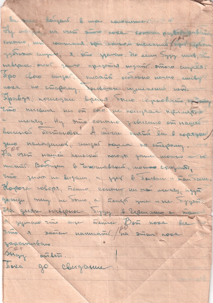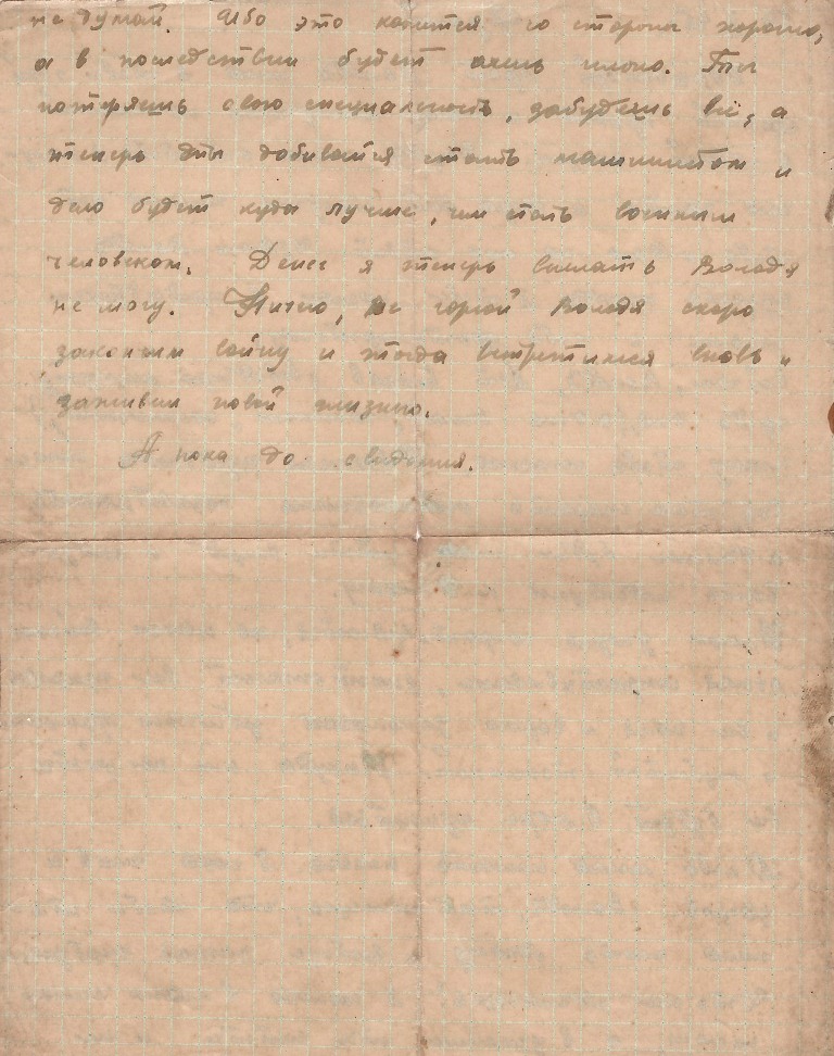 О себе много писать нечего. Я пока жив и здоров. Володя, ты пишешь, что тебя тянет жить одному и вообще плохая житуха. Что же сделаешь? Я сколько в моих силах помогу, а в училище ты идти и не думай. Ибо это кажется со стороны хорошо, а в последствии будет очень плохо. Ты потеряешь свою специальность, забудешь все, а теперь ты добивайся стать машинистом и дело будет куда лучше, чем стать важным человеком. Денег я теперь выслать Володя не могу. Ничего, не горюй Володя скоро закончим войну и тогда встретимся вновь и заживем новой жизнью.