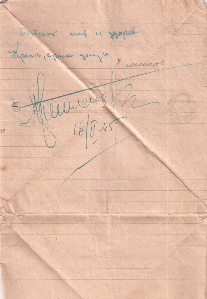 Коля бил мой верний друг послужбе я с ним служил вместе 2 года, но сичас вашего брата а мого друга Коли нет в живых, 22 ноября 1944 года Коля погиб. Смертью храбрых за нашу родину, и я Колю сам лично хоронил на писали Коли на досточки Гвардии старший сержант. трижди ординоносец он имел три награди и Коля бил член парти, хороший бил. Но сичас его нет. Елисавета. А, верте моему письму, Лиза ви писали Коли письма письма пришли но Коли нет. Я письма ваши прочитал ви пишете что довас заежал брат ваш, Сережа и говорил что вас заберу ксебе жить после войны и мать уже вмерла скоро буде год