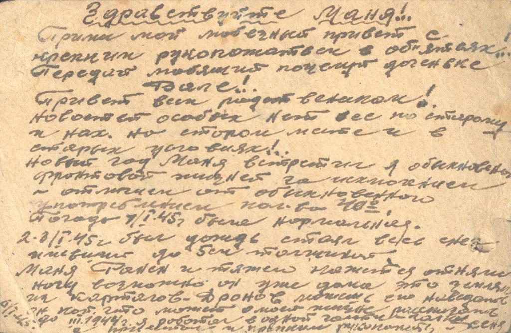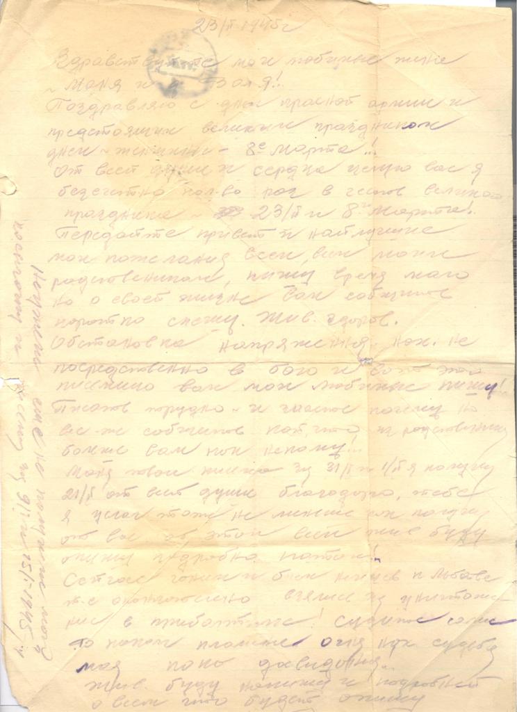 Поздравляю с днём Красной армии и предстоящим великим праздником днем женщин 8-е Марта!.. От всей души и сердца целую вас я безсчетное кол-во раз в честь великого праздника 23/II и 8 Марта! Передайте привет и наилучшие мои пожелания всем, всем моим родственникам, пишу время мало но о своей жизни Вам сообщить коротко спешу. Жив здоров.