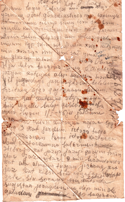 Здравствуй сестричка Забаржат. Я передаю свой красноармейский пламенный привет. Я узнал, что ты жива и здорова и очень рад этому. Маве, Флюре и всем деревенским девчатам в письме передашь привет. Я сейчас жив и здоров, веду службу. Мы вместе с Ильей Обуховым. Твое письмо получил, прочитал и узнал все новости и родине. Узнал, что Фарида Валеева комиссовали по состоянию здоровья. Прочитал письмо и стало очень радостно. Сегодня 1 января 1945 года. Написал сегодня 3 письма завтра получу свою фотографию и ее отправлю тебе. Пробую писать письма маме с папой, но ответа от них не получаю. Письма обязательно мне пиши, я буду очень счастлив. Ты спрашивала, далеко ли фронт? От Москвы 260 километров западнее Калининграда. Будешь писать письма родителям, обязательно передай, чтобы писали мне. Больше новостей нет. Твой брат Таржиман.