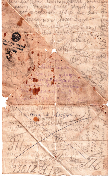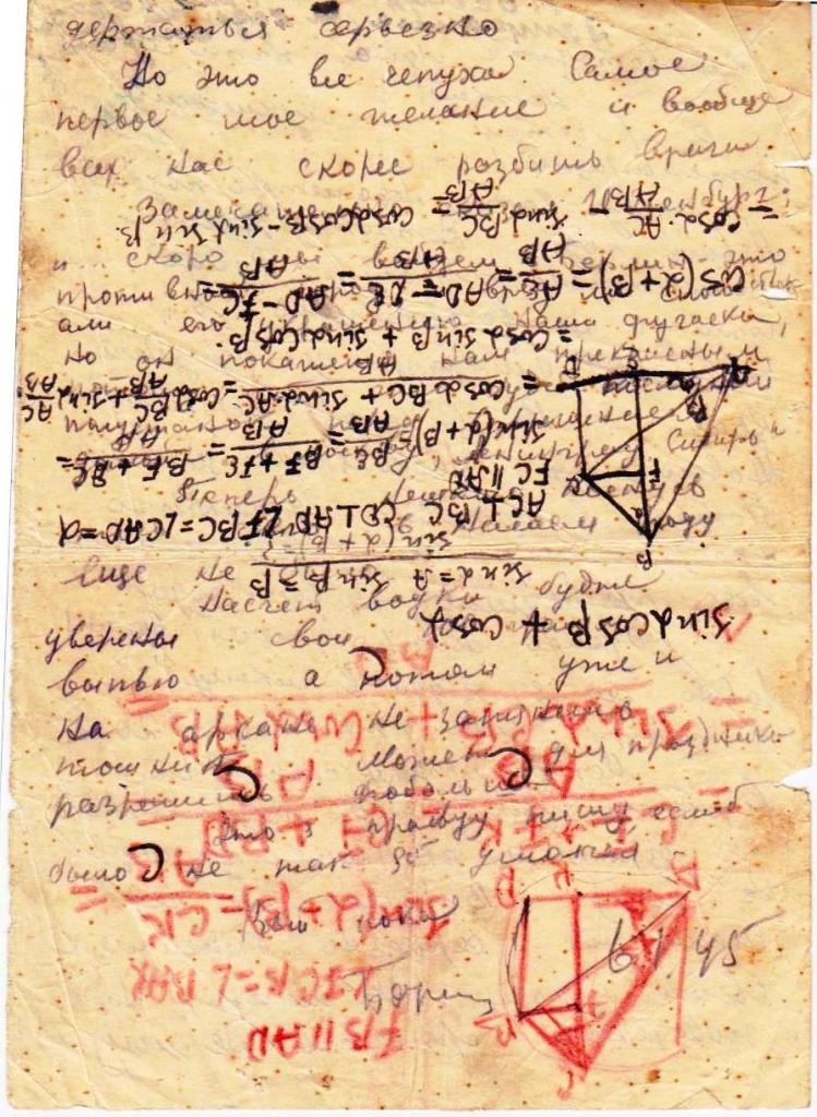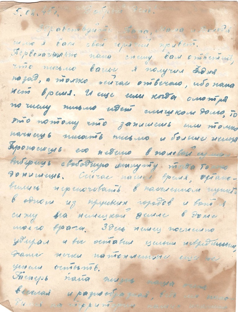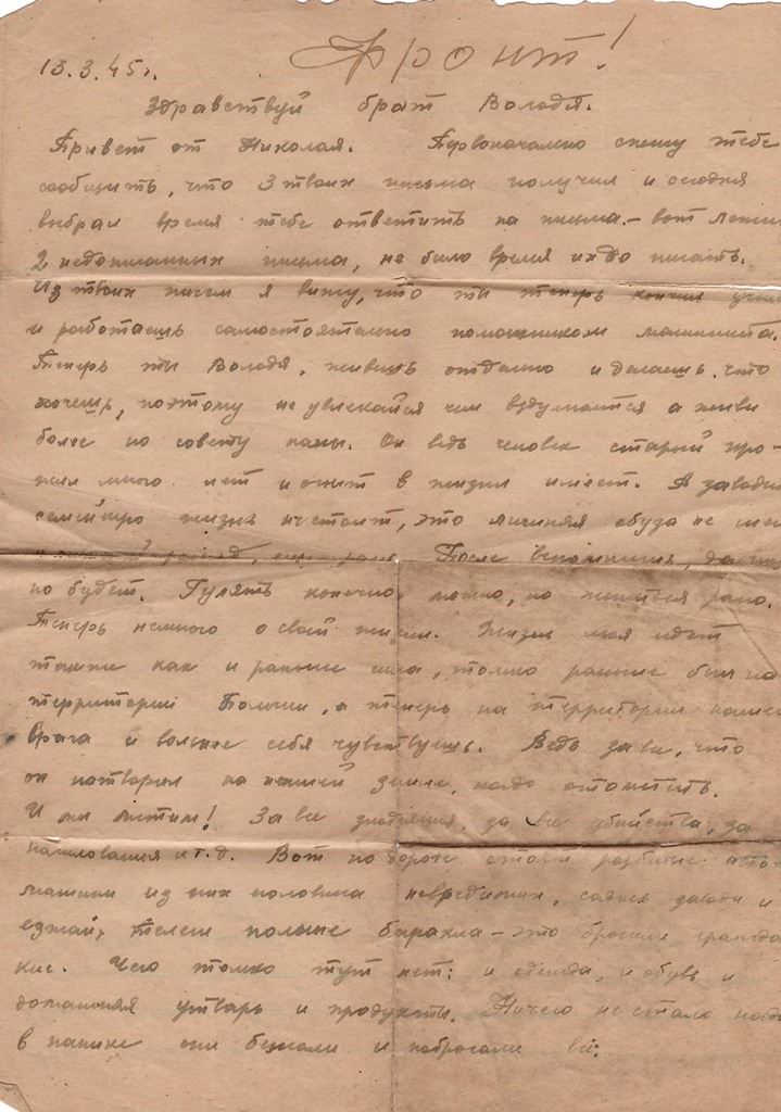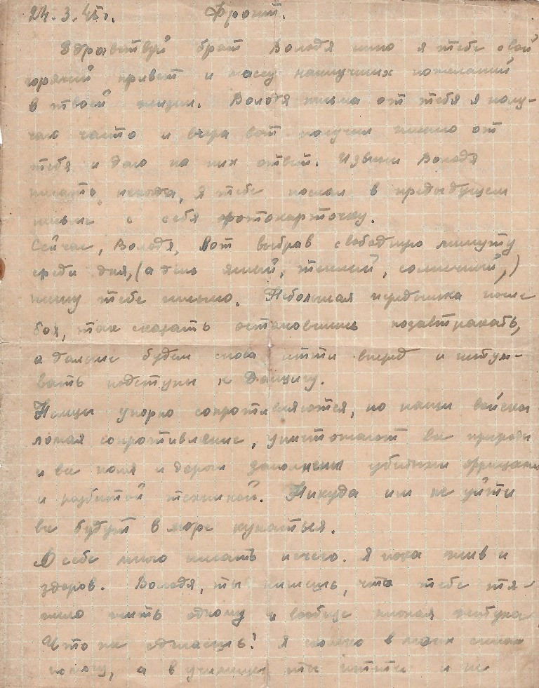 Здравствуйте Папа, Мама и Володя шлю я вам свой горячий привет. Первоначально папа спешу вам ответить что письмо ваше я получил 3 дня назад, а только сейчас отвечаю, ибо папа нет время. И ещё если когда смотря по числу письмо идёт слишком долго, то это потому что запишешь или только начнёшь писать письмо и больше нельзя. Проносишь его неделю в полевой сумке выберешь свободную минуту тогда только допишешь. Сейчас нашёл время, остановились переночивать в населённом пункте в одном из прусских городов и вот я сижу на немецкой земле в доме моего врага. Здесь немец поспешно удирал и всё оставил целым невредимым, даже печки натопленные ещё не успели остыть. Теперь папа жизнь наша очень весёлая и разнообразная, ведь мы находимся на территории наших исконных врагов, наших убийц, на земле пруссаков.