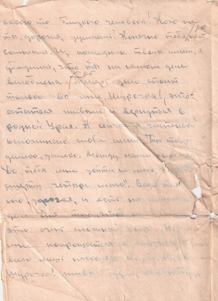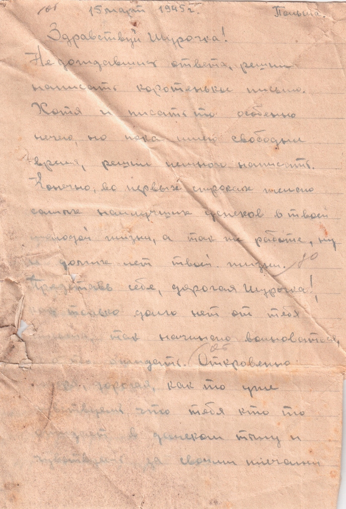 Не дождавшись ответа, решил написать коротенькое письмо. Хотя и писать то особенно нечего, но пока есть свободное время, решил немного написать. Конечно, во первых строках желаю самых наилучших успехов в твоей молодой жизни, а так же работе, ну и долгих лет твоей жизни. Представь себе, дорогая Шурочка! Как только долго нет от тебя письма, так начинаю волноваться,и твоё ожидать. Откровенно говоря, дорогая, как то уже чувствуешь, что тебя кто- то ожидает в далёком тылу и чувствуешь за своими плечами кого то близкого человека! Кого же ты, дорогая, думаешь? Конечно тебя, нет сомнения. Из последних твоих писем, я убедился, что ты на самом деле влюблена. Теперь дело стоит только во мне, Шурочка! Это остаться живым и вернуться в родной Урал. А сейчас я частенько вспоминаю слова песни: «Ты теперь далеко, далеко. Между нами поля и леса.
