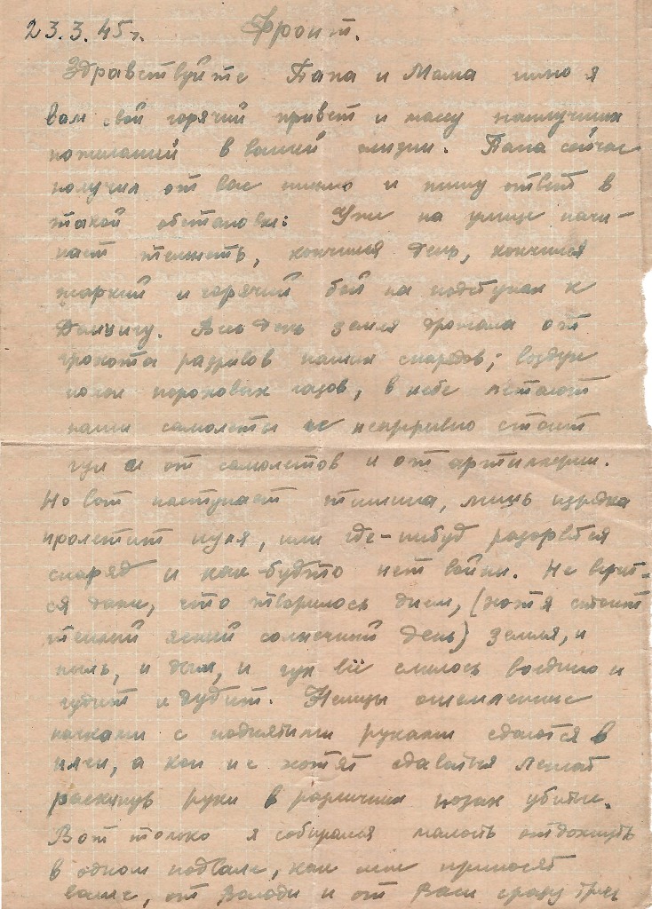 Здравствуйте Папа и Мама шлю я вам свой горячий привет и массу наилучших пожеланий в вашей жизни. Папа сейчас получил от вас письмо и пишу ответ в такой обстановке: Уже на улице начинает темнеть, кончился день, кончился жаркий и горячий бой на подступах к Данцигу. Весь день земля дрожала от грохота разрывов наших снарядов; воздух полон пороховых газов, в небе летают наши самолёты и непрерывно стоит гул и от самолётов и от артиллерии.