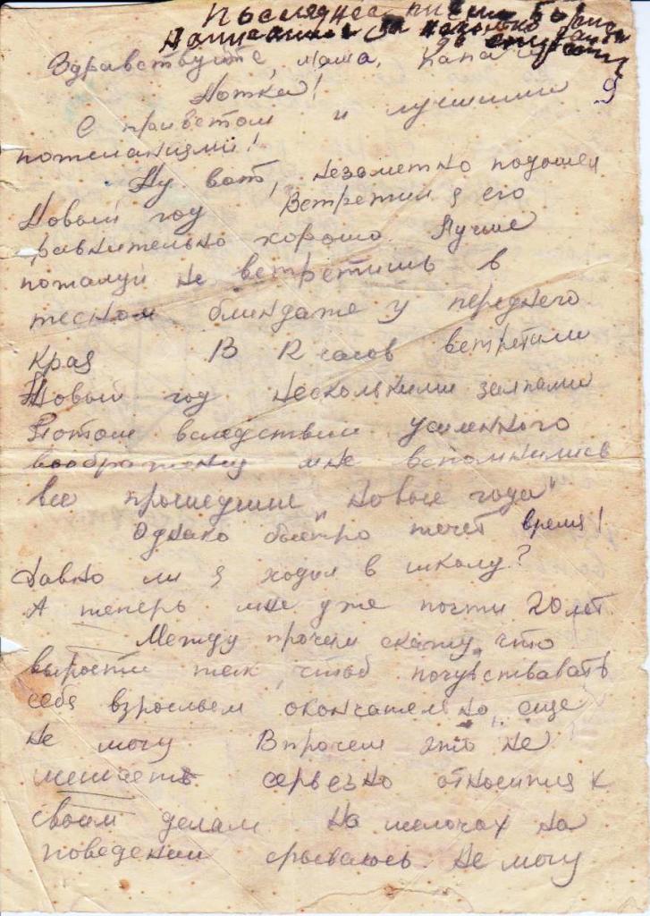 Здравствуй брат Володя шлю я тебе свой горячий привет и массу наилучших пожеланий в твоей жизни. Володя письма от тебя я получаю часто и вчера вот получил письмо от тебя и это на них ответ. Извини Володя писать некогда, я тебе послал в предыдущем письме с себя фотокарточку.