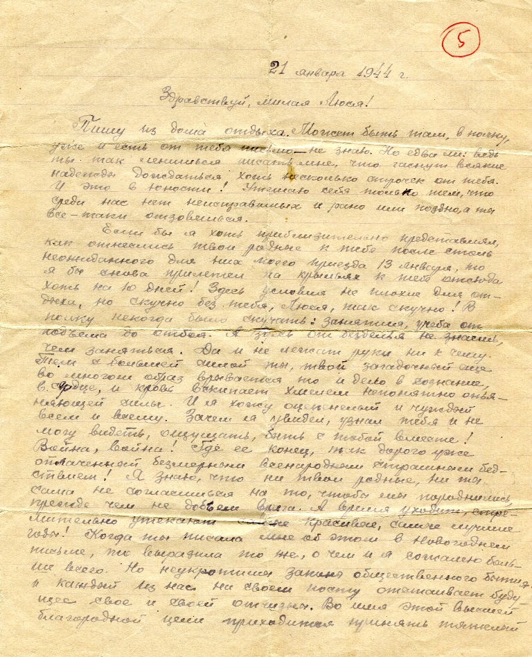 Если бы я хоть приблизительно представлял, как отнеслись твои родные к тебе после столь неожиданного для них моего приезда 13 января, то я бы снова прилетел на крыльях к тебе отсюда хоть на 10 дней! Здесь условия неплохие для отдыха, но скучно без тебя, Люся, так скучно! В полку некогда было скучать: занятия, учеба от подъёма до отбоя. А здесь от безделья не знаешь, чем заняться. Да и не лежат руки ни к чему. Тем с большей силой ты, твой загадочный еще во многом образ врывается то и дело в сознание, в сердце, и кровь вскипает хмелем непонятно опьяняющей силы. И я хочу оцененный и чуждый всем и всему. Зачем я увидел, узнал тебя и не могу видеть, ощущать, быть с тобой вместе! Война, война! Где её конец, так дорого уже оплаченный безмерным всенародным страшным бедствием! Я знаю, что ни твои родные, ни ты сама не согласишься на то, чтобы мы породнились, прежде чем не добьём врага. А время уходит, стремительно утекают самые красивые, самые лучшие годы! Когда ты писала мне об этом в новогоднем письме, то выразила то же, о чем и я сожалею больше всего. Но неукротимы законы общественного бытия, и каждый из нас на своём почту отстаивает будущее своё и своей отчизны. Во имя этой высшей благородной цели приходится принять тяжелый крест разлуки, душевных и иных лишений нам, простым смертным.