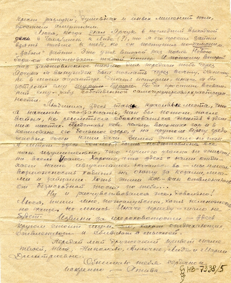 Люся, когда ехал Ярчук в последний выходной день в Челябинск, к Лиде (?), то я его просил зайти взять письмо к тебе, но он поступил по-хамски и «забыл» зайти. Это уже второй раз после Нового Года он откалывает такой номер. И потому второй раз заготовленное письмо для передачи тебе через Ярчука я вынужден был послать через почту. Конечно, не в моём характере делать истории, иначе я бы устроил ему шурум-бурум. Но да простит всевышний ему – рабу собственной само через пересверх растерянности.